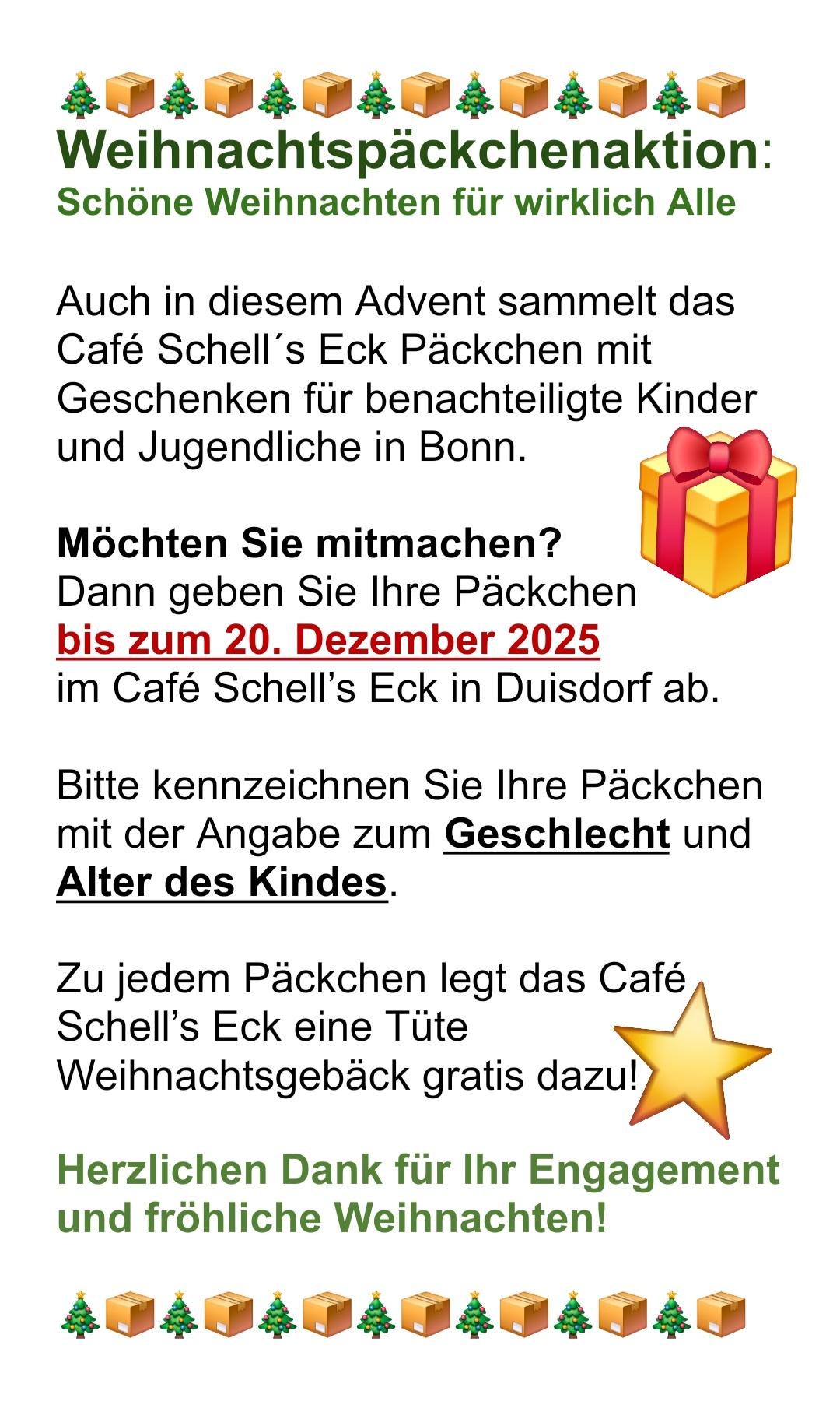Möchten Sie mitmachen? Dann geben Sie Ihre Päckchen bis zum 20. Dezember 2025 im Café Schell´s Eck, Rochusstraße 257 in 53123 Bonn-Duisdorf ab.