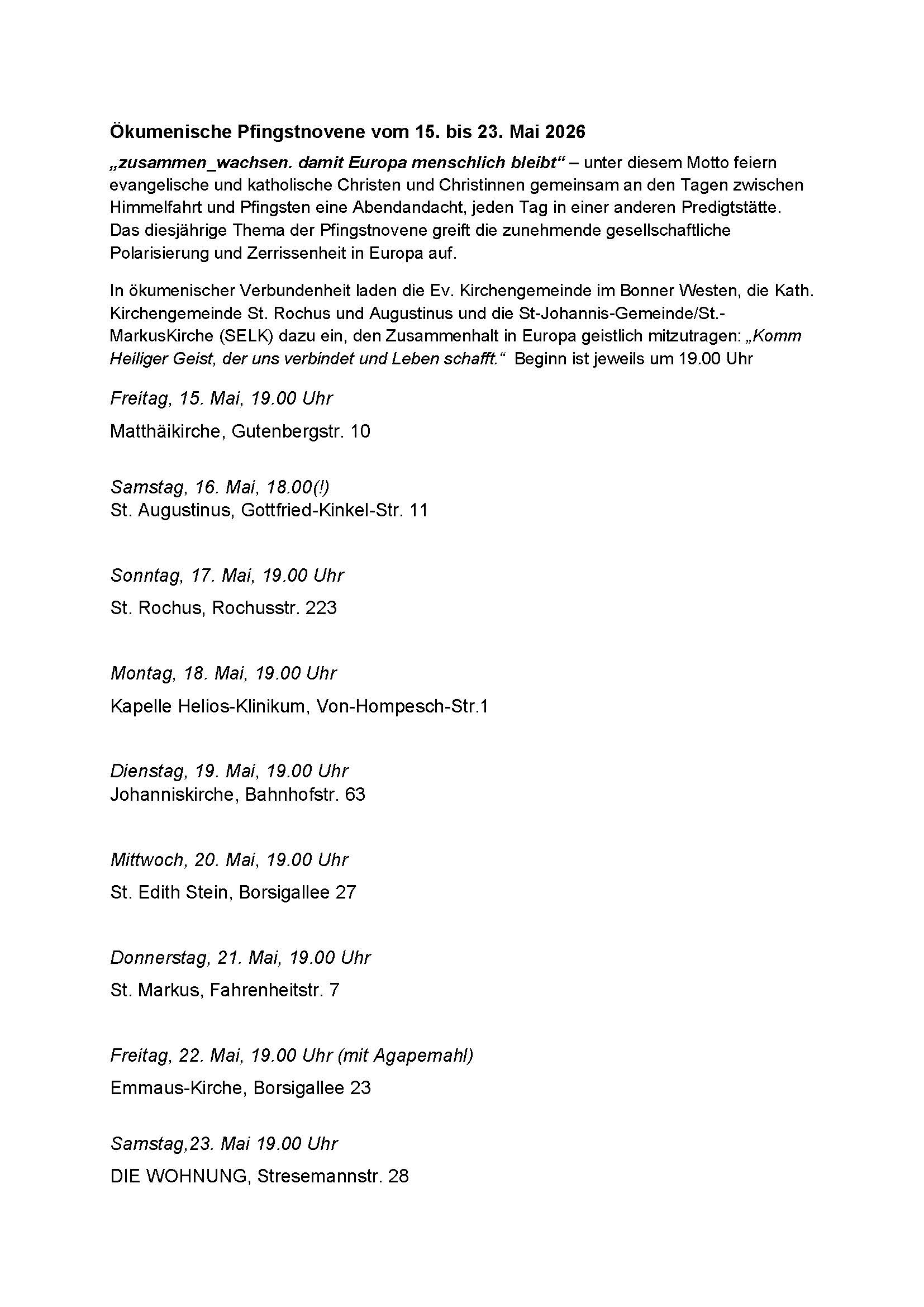 Ökumenische Pfingstnovene vom 15. bis 23. Mai 2026
